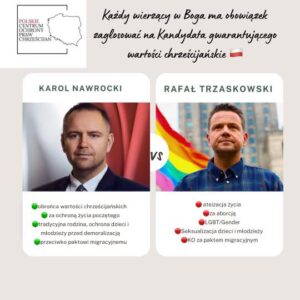 Apelujemy do wszystkich Wyborców do należytej oceny kandydatów na Prezydenta RP i do głosowania na tego, który opowiada się za wartościami chrześcijańskimi. Z uwagi na to, że w procesie legislacyjnym są już obecne przepisy prawa, które realizują postulaty ideologii antychrześcijańskich, tylko odpowiedzialne decyzje Prezydenta RP mogą uchronić naszą Ojczyznę przed wprowadzeniem tychże szkodliwych dla polskich Rodzin zmian.